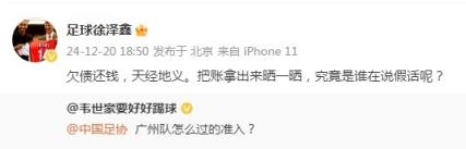 媒體人“足球徐澤鑫”寫(xiě)道:“欠債還錢(qián),天經(jīng)地義。把賬拿出來(lái)曬一曬,究竟是誰(shuí)在說(shuō)假話呢?”